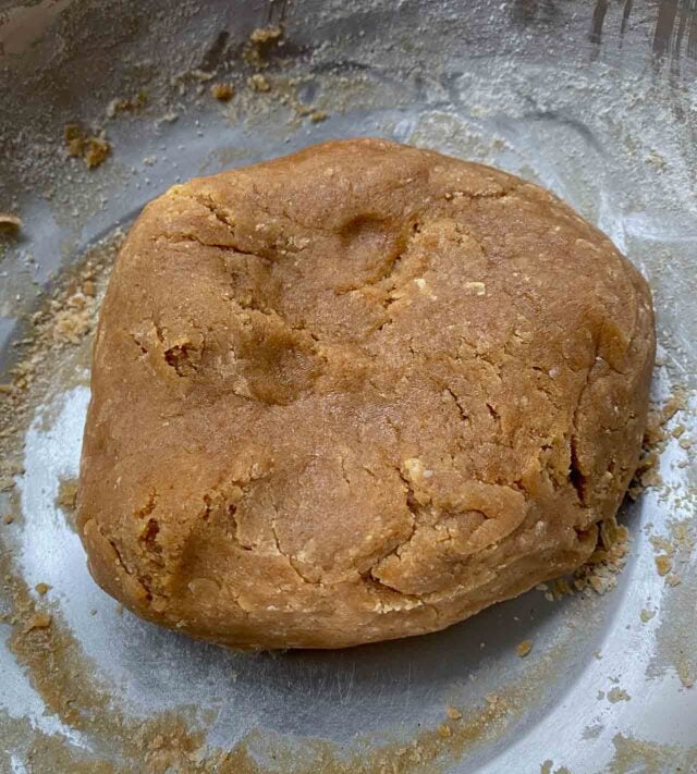 Second: As much as I love natural peanut butter, and crunchy natural is definitely my choice for swiping on a piece of bread or toast, the picture above shows what happened I tried the dough with natural peanut butter. The dough so dry I had a hard time patting it evenly in the pan. If you want to know dry it was, if you look closely, you can make out some of my fingerprints in it.