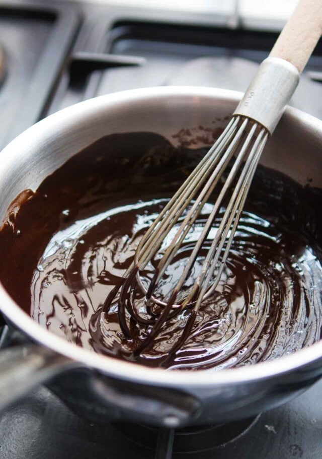 - Make the brownie layer by melting the butter in a small saucepan over low heat, adding the cocoa powder when the butter is mostly melted, stirring or whisking until completely smooth. Remove from heat and set aside.