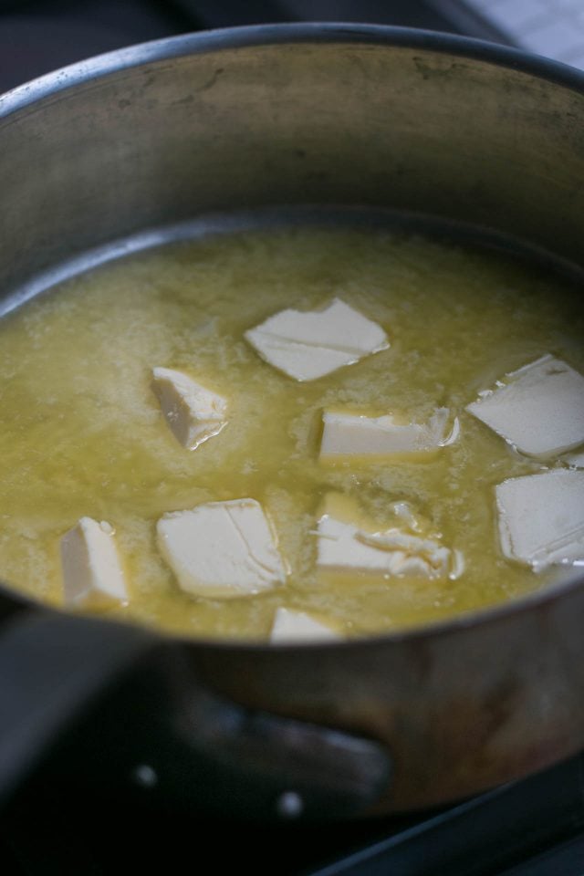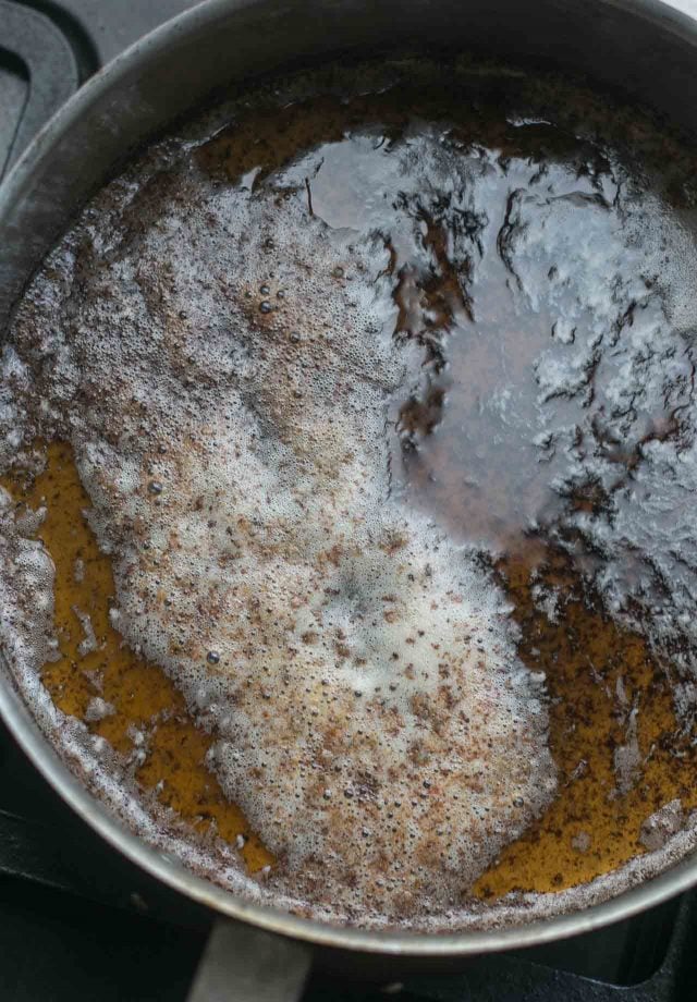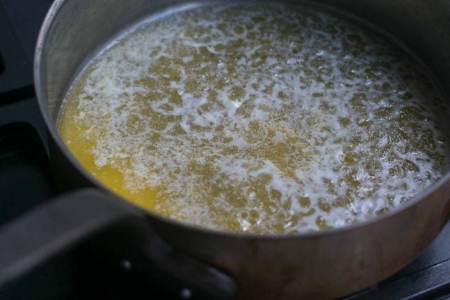 - As the butter cooks, tilt the pan to avoid burning in spots. When the butter quiets down and has turned a nice amber brown color, and smells deliciously nutty, remove from heat and let cool until tepid.