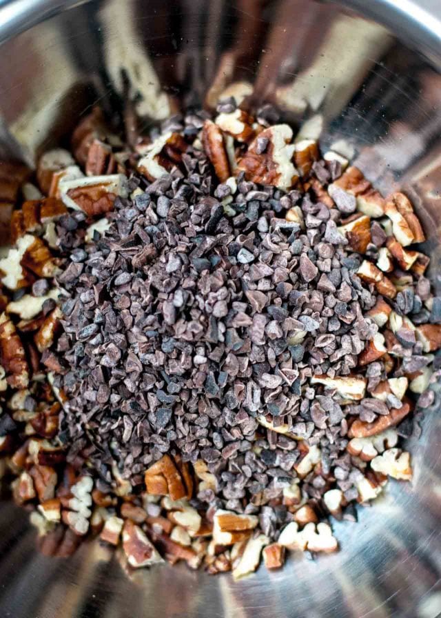 - Mix in the chopped chocolate (including any small bits of chocolate left on the cutting board), toasted buckwheat groats or cocoa nibs, if using, and nuts. Cover the bowl and chill overnight.