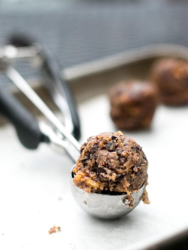 - Preheat the oven to 350ยบF (180ยบC). Line two baking sheets with parchment paper or silicone baking mats. Use a spring-loaded cookie/ice cream scoop, or your hands, to form 1 1/2-inch (4cm) balls of dough and place them evenly spaced (about 2 1/2-inchs/6cm) apart on the baking sheet. Slightly flatten the tops and sprinkle lightly with flaky sea salt.