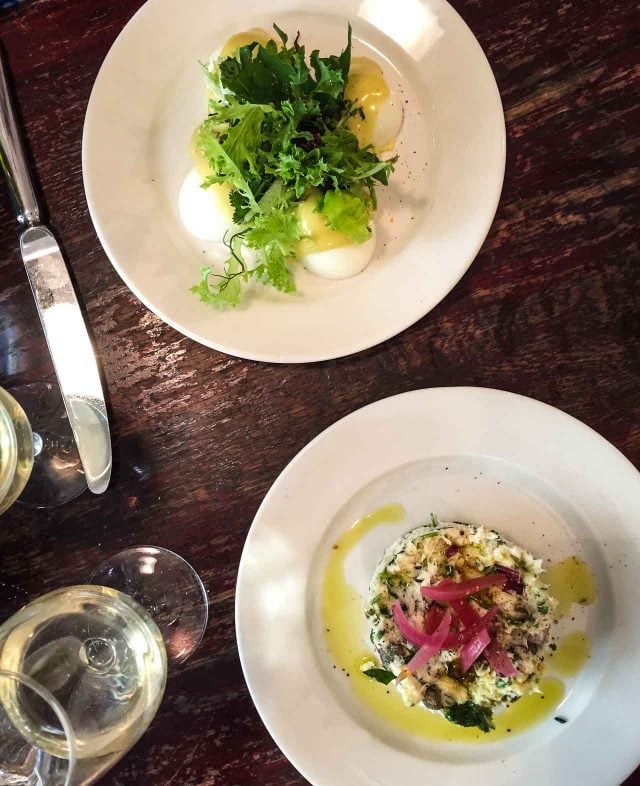 Iโm hopelessly hooked on ลufs mayonnaise, the bistro classic of hard-cooked eggs with mayonnaise. This dish doesnโt really need much updating, except maybe using organic eggs, as they do here, topped with what tasted like house-made mayo. The other appetizer that we split while catching up (i.e.; meย getting caught up on San Francisco gossip), was aย rillette of fish with capers, cilantro, and lemon, with a drizzle of good olive oil, lots of freshly chopped herbs, and strips of tangy pickled red onions.