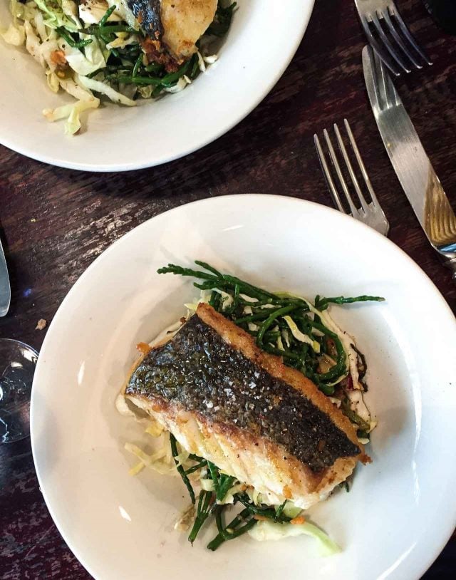We both went with merlu (hake) for main courses atop crunchy cabbage salad and salicornes (glasswort), whose briny taste linked the salad to the salty, crisp-skinned fish, cooked by someone not afraid to give food the texture, and flavor, that quick-searing over high heat gives it.
