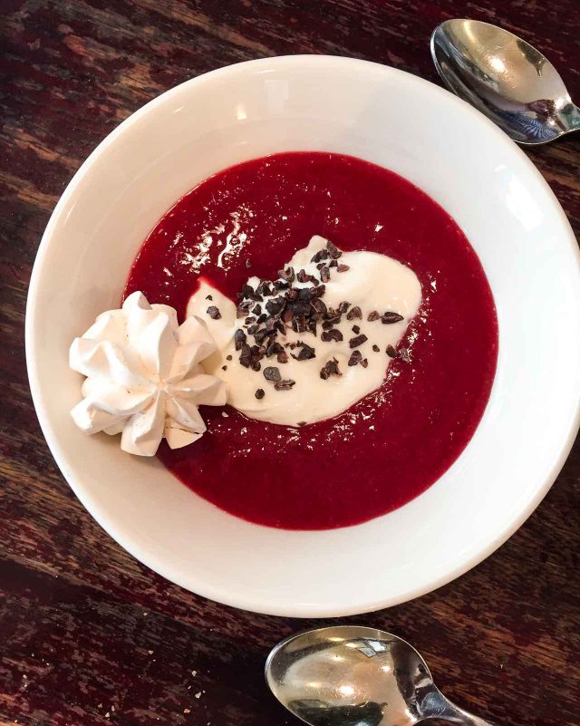 Nowadays the peaches are celebrated for their concentrated peach flavor, and thick, rich, rosy pulp. The soup was, indeed rich, and more of a puree, and served with a spoonful of fromageย blanc, a scattering of roasted cocoa nibs, and a meringue, that Michael tried to spoon up, thinking it was a rosette of whipped cream gone wrong. (Ah, jet-lagโฆ) While I thought it would have been nice served with a contrasting scoop of sorbet, we left happy.