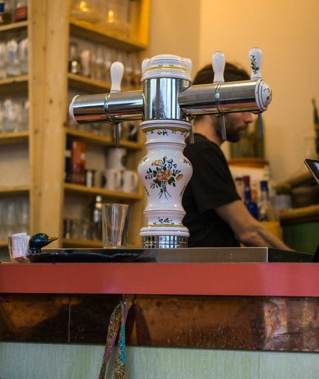 The wines are Cafรฉ du Coin are natural wines, meaning they are made without additives or sulfites and the taste can be not what people are expecting, if theyโre expecting a glass of traditional wine. In France, a glass of wine is โฌ5-8 (more or less) in a restaurant, so itโs not a big deal if the wine you get isnโt quite what you were thinking. But when itโs $12 to 16 a glass, plus tax and tip, as a glass of wine can be in the U.S., expectations when youโve dropped $20 on a glass of wine are different.