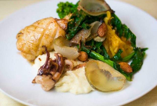 Not being a squid-eater, I admired my dining companionโs plate, accompanied by almonds, celery, squash and cimiย di rapa, similar to turnip greens, but declined a taste.