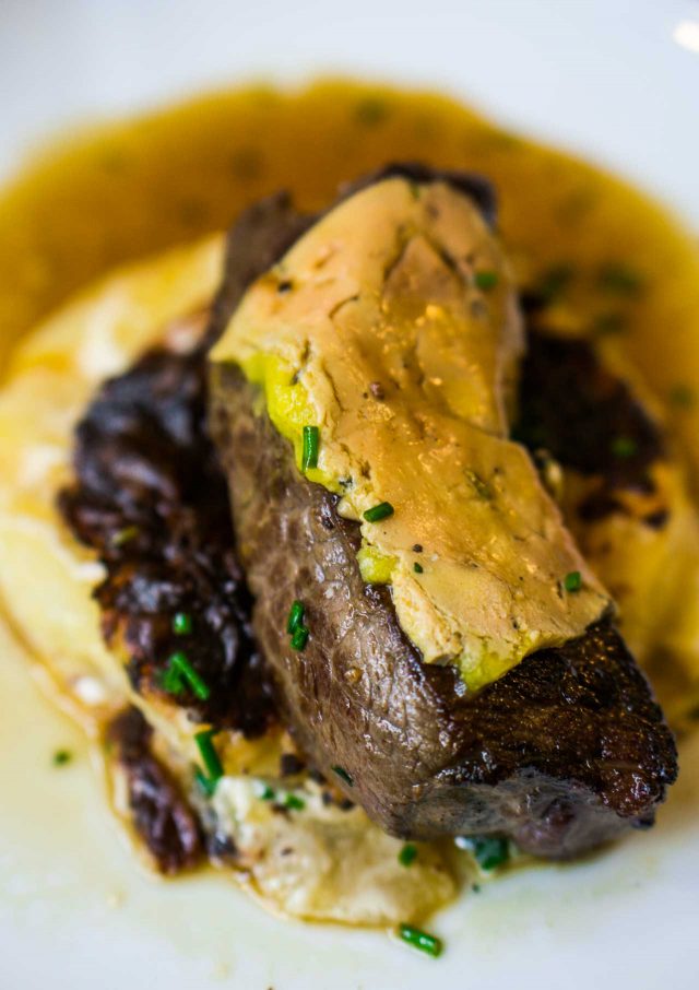 My Rumsteak Rossini was a very generous portion of beef with a thin slice of foie gras melting on top. I saw other plates going out with heftier slices of liver on top, but the thin one was just right for the beef, which was served atop an excellent gratin Dauphinois (potato).