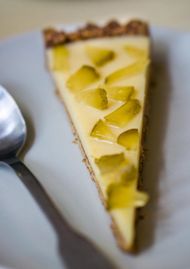 I went with the grapefruit tart with candied citron. The filling had a pleasing tanginess and Iโll eat a Michelin tire if it has citron on it. So I greatly appreciated the effort of the kitchen to candy the citron and make such a nice presentation. The crust could have come out of the oven a few minutes earlier, but it was nice to get a housemade dessert, and the slice was devoured.