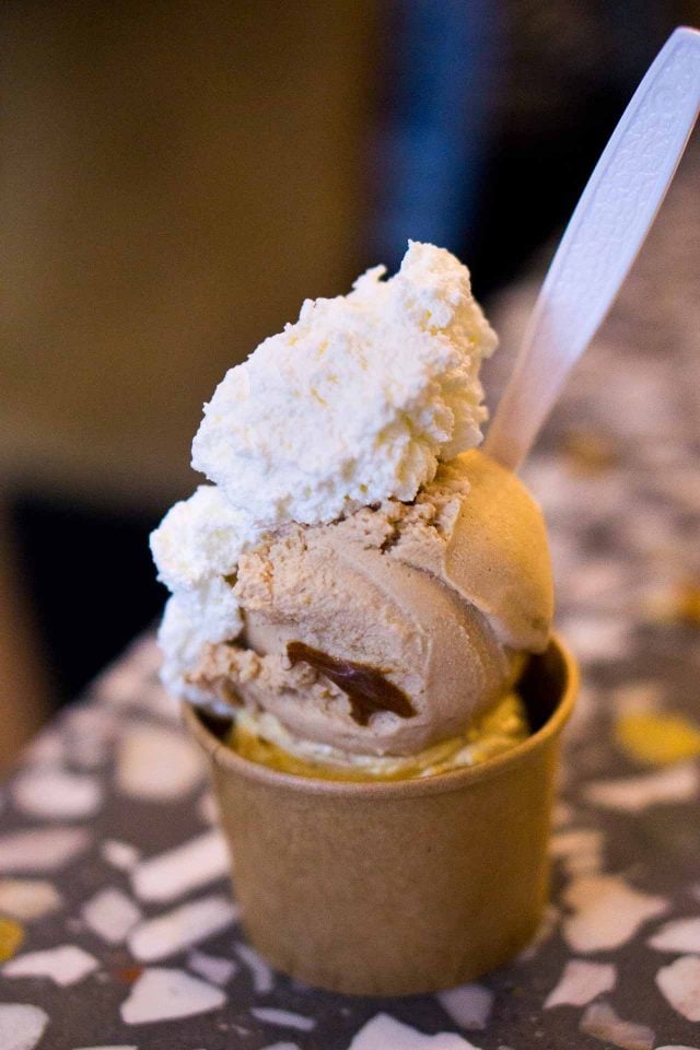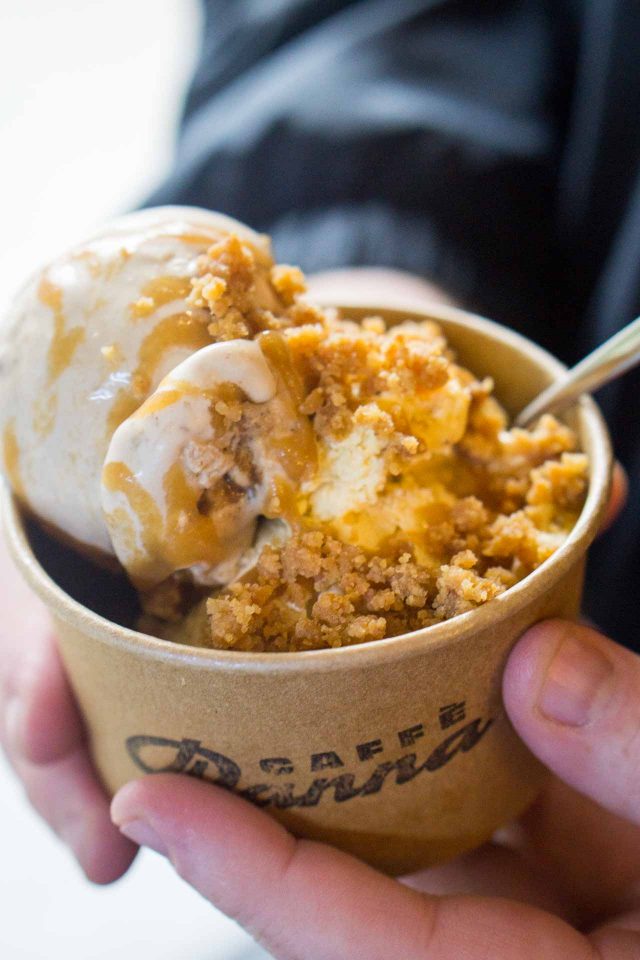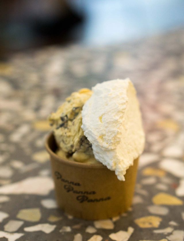 Inspired by the gelaterias in Rome, she finally opened Caffรจ Panna in Manhattan. Panna is Italian for cream, and gelato in Italy is often served with panna; with a dollop of whipped cream on top. As I mentioned in The Perfect Scoop, some visitors are surprised by that and scrape it off once outside (which Iโve seen in Italy.) But to Hallie, the whipped cream was her favorite part, and she even named a previous ice cream venture Tripla Panna, since she loves it so much. (She told me tripla panna was her nickname in Rome, as she was known at her local gelateria for always ordering three scoops of gelato.) So itโs the policy at Caffรจ Panna that whipped cream can be added to any cup or cone of ice cream at no extra charge.