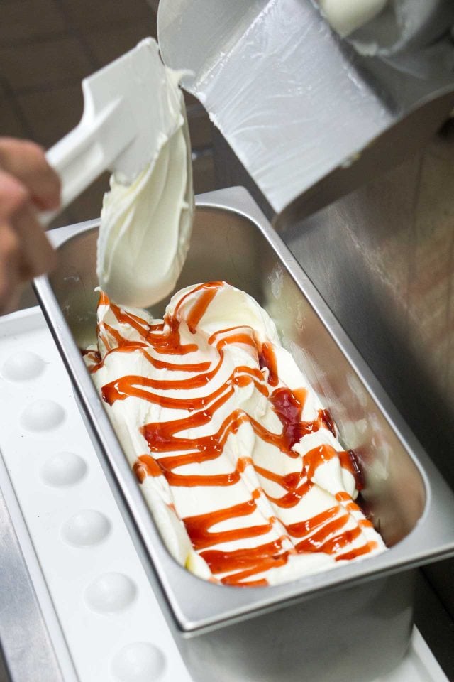 So that green scribble you see on the ice cream is Sicilian pistachio paste thinned with olive oil, but no colorants.