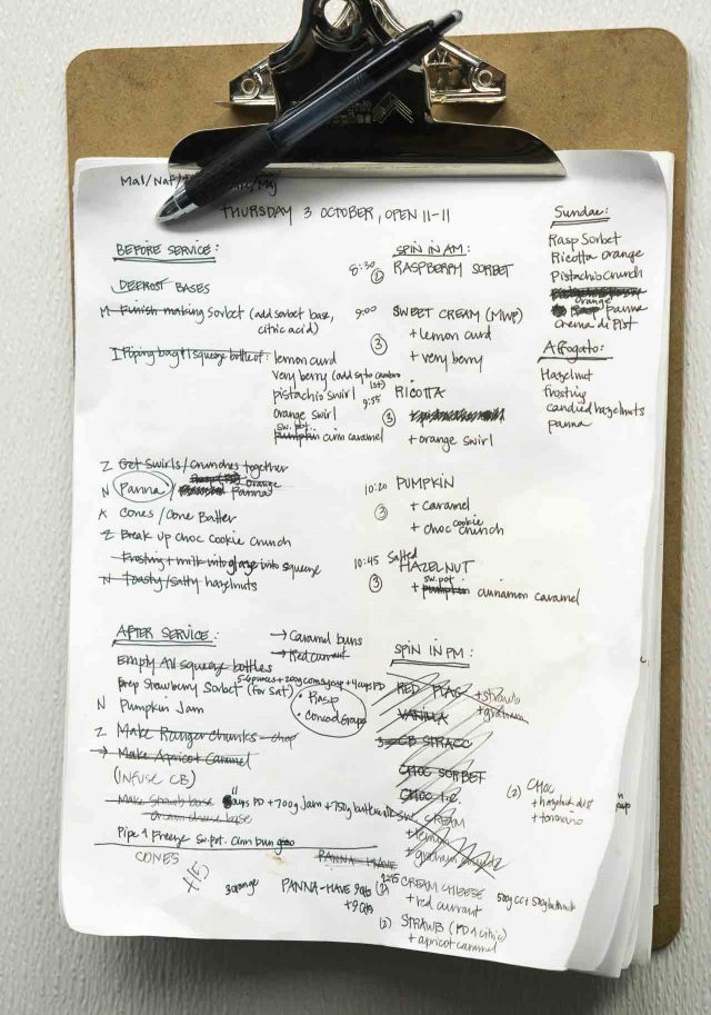 Cones are baked in-house using lingua di gatto, โcatโs tongueโ butter cookie batter, and rolled up throughout the day. And are just one of the many items on their daily prep list.