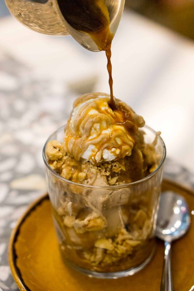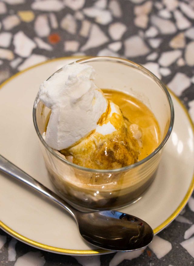 Affogato is the Italian way of pouring hot coffee over ice cream, and itโs one of the great culinary inventions, marrying two things Italians do so well. Like the ice cream flavors that change daily, there are daily affogato and sundae specials, too.