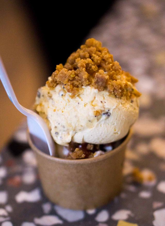 Iโve been in a few times since they opened a little over a week ago, and one of the best sundaes they had was made with hazelnut ice cream, above. Itโs got a sweet potato-cinnamon โgooโ made by massaging sweet potato cinnamon buns (made by Millers & Makers in Brooklyn, who Hallie says are truly a mom & pop business, and make โthe best cinnamon buns Iโve ever hadโ) with caramel, then topped with a cream cheese drizzle.