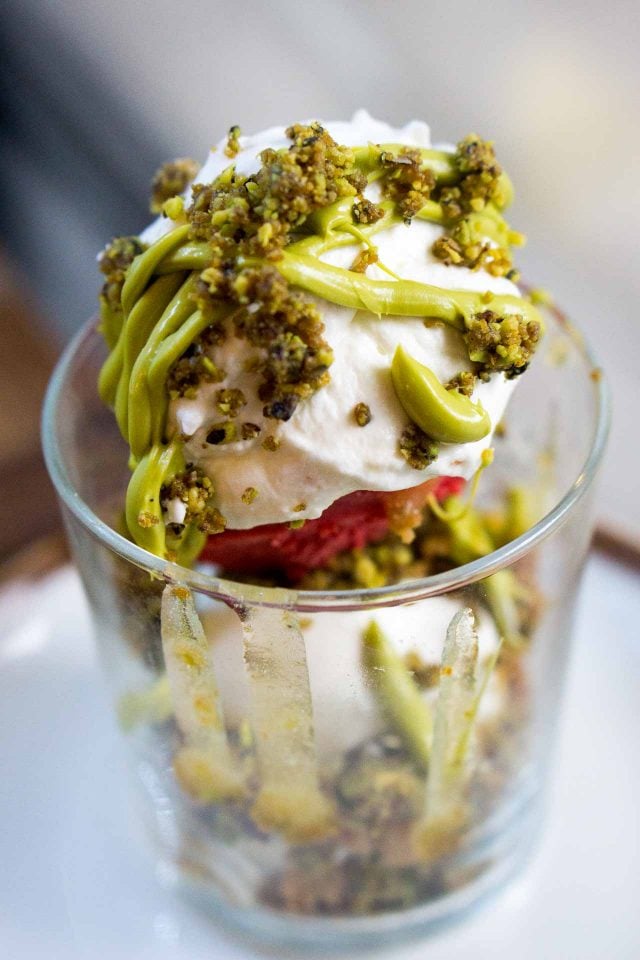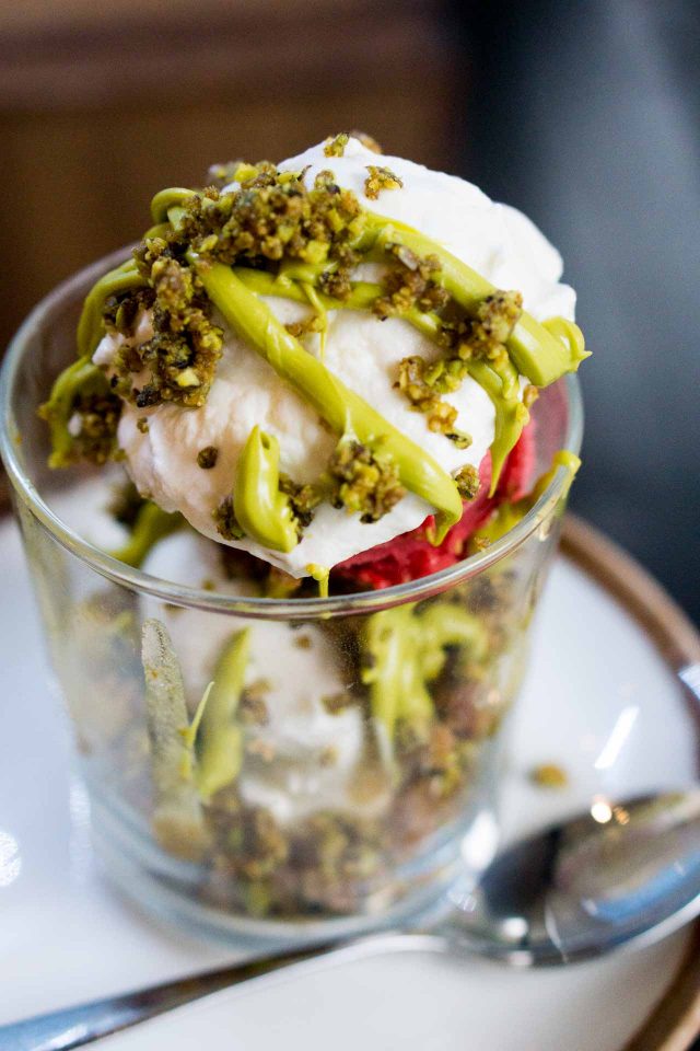 Each sundae includes two flavors of ice cream, one crunchy element, a drizzle or scribble of sauce, and whipped cream. The one with the pistachio drizzle shown at the top of this post is made with ricotta ice cream swirled with orange, Sicilian pistachio crunch, raspberry sorbet, and orange-flavored panna.