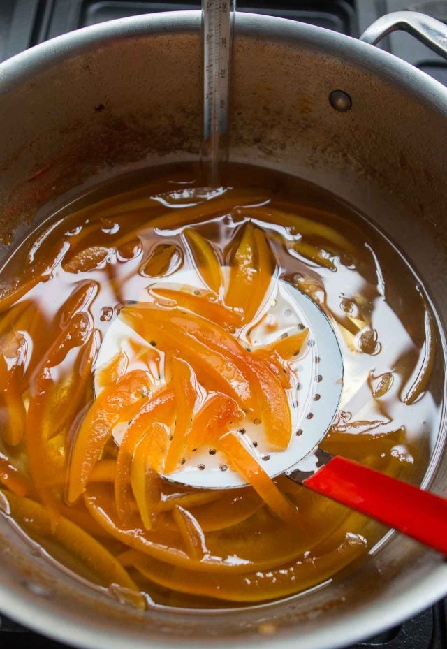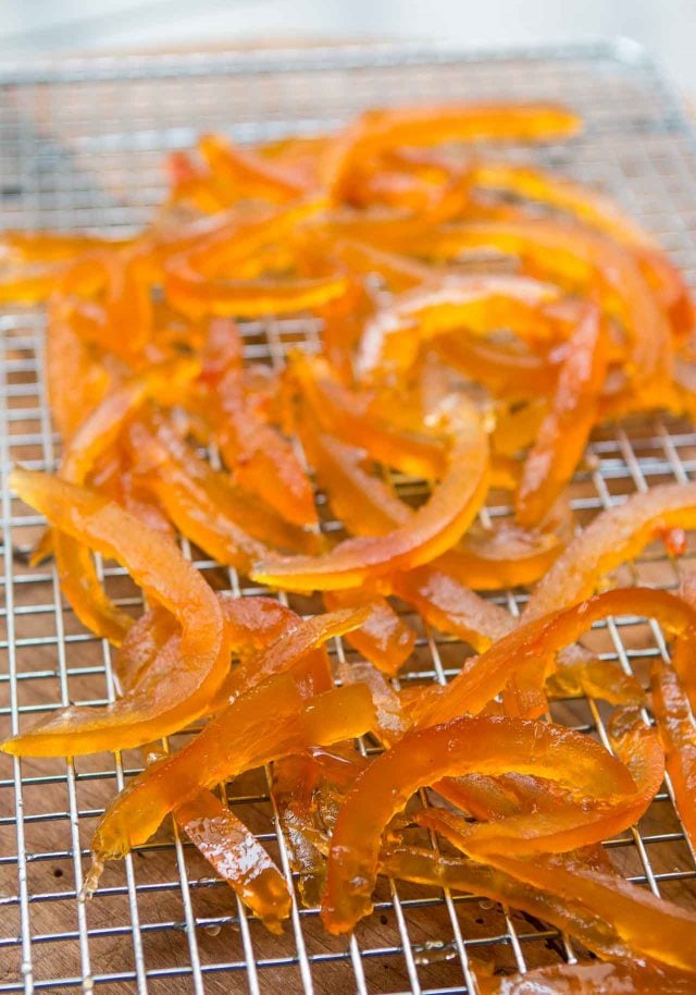 - Place the peels back in the pot. Attach a candy thermometer to the side of the pot and add the 3 cups sugar, 2 1/2 cups water, and corn syrup. Cook over medium-high heat until the temperature reaches 225ยบF (107ยบC.) Turn off the heat and use a slotted spoon to transfer the grapefruit peels onto a wire cooling rack set over a baking sheet, separating the peels into a single layer, Let the peels sit overnight. (You can reserve the syrup and use it for sweetening iced tea or lemonade, or another purpose.) If you don't have a wire rack, you can use a colander or mesh strainer set over a bowl, gently turning the peels several times, to help them drain.