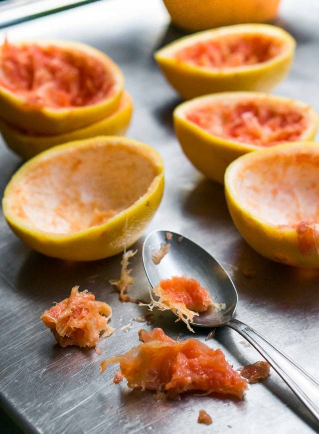 - Cut each grapefruit and half and juice them. (Reserve the juice for another purpose.) Use a soup spoon to scrape out the pulp and membranes.