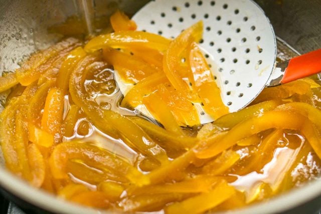 - Reduce the heat to a low boil and cook the peels until they're translucent and glossy. The temperature should read about 218ยบF (103ยบC) and should take about 45 minutes. If you're not using a thermometer, it should look like the 7th photo in the post.
