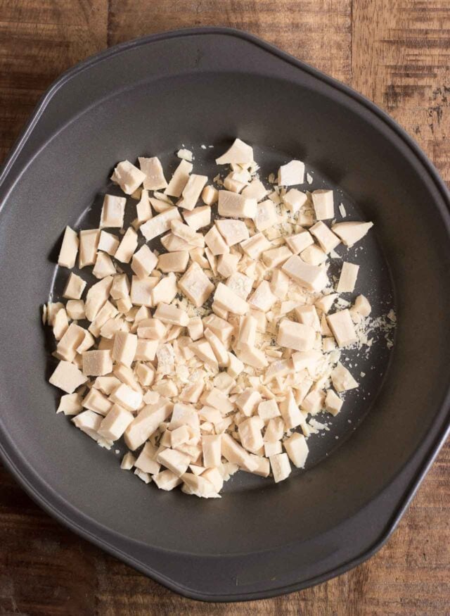 - Put the white chocolate in a cake pan or pie tin. Cook the white chocolate for about 12-15 minutes, stirring midway during baking, until the white chocolate is a deep golden brown, but not burnt. (See pictures in the post. Once again, better to rely on visual clues rather than strict times.) It'll be crumbly, which is normal. (The authors said to bake it for 30 minutes, stirring it every ten minutes, but mine baked faster. I used Lindt white chocolate and brands can vary.) While the white chocolate is baking, heat the cream in a small saucepan or microwave oven until it's almost boiling.