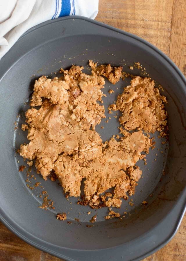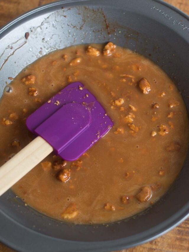 The topping of the pie is a caramelized white chocolate ganache, based on something I learned to make when I went to chocolate school in France. Caramelized white chocolate originally was a mistake made by one of their pastry chefs and honestly, when you mix it up, you may feel like youโve made a goof. In the authorโs method, you end up with a crumbly mess then add hot cream, then do your best to stir it until smooth. Mine took a bit of cajoling to get there.