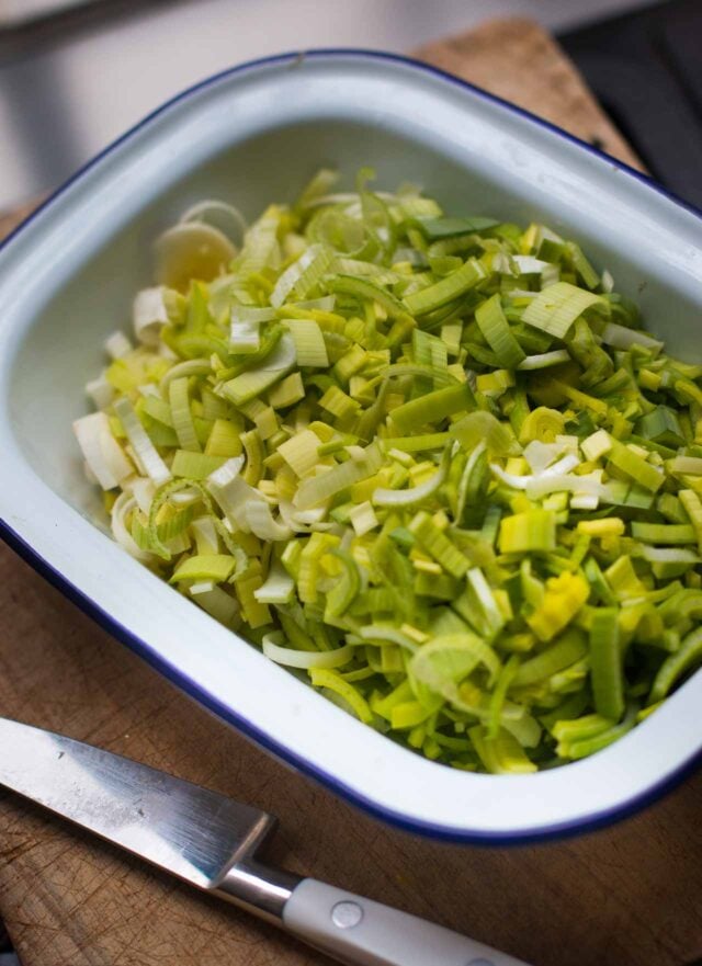 The best way to clean leeks is to cut off the very dark, tough, green parts, which the sellers will do for you at the markets, making it easier for you to put them in your shopping basket. (Although there are ways to cook with them.) Use a knife to cut them lengthwise, starting just below the Billy goat beard-like end, keeping it intact. Then turn the leeks a quarter turn and make another lengthwise cut in each. Fill a deep bowl with cold water, spread open up the layers with your fingers, and swish them around briskly until thereโs no grit at the bottom of the bowl or between the leek layers. Depending on the leeks, you may need to double-wash them to ensure thereโs no grit. (There are some pictures here.)