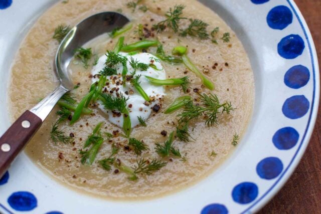 Celery Root Soup is very easy to prepareโand cheap. I think an entire pot of soup cost me less than five euros in ingredients and took me less than ten minutes to put together. While leeks are very French โ faire le poireau means to wait forever for someone (because leeks grow slowly) โ they are quickly scooped up at the markets, but onions will do well in this soup in their place.