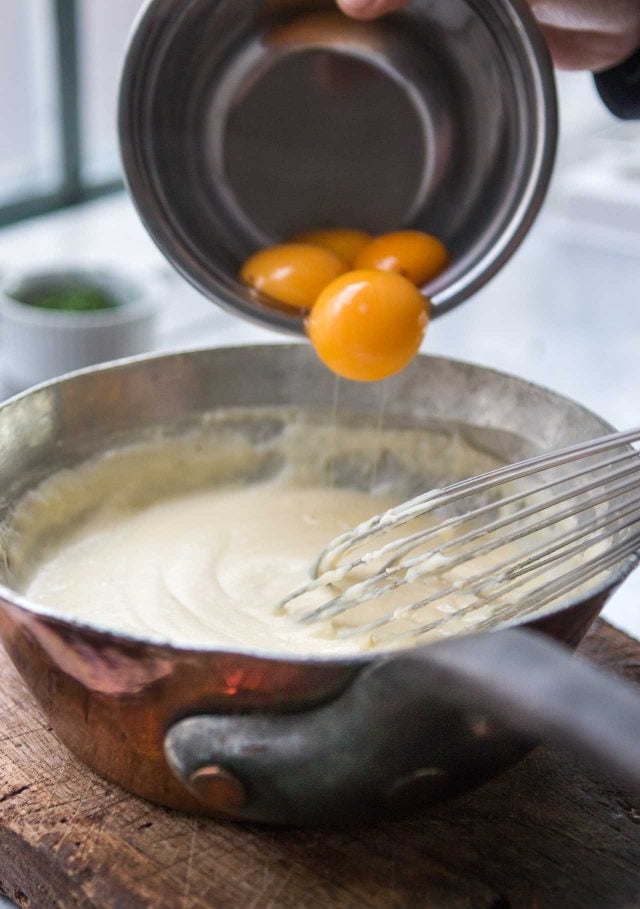 - Remove from heat and whisk in the salt, a generous amount of freshly ground pepper, nutmeg, and cayenne. Whisk in the egg yolks vigorously, one at a time. Scrape the mixture into a medium to large bowl and let cool a bit until only slightly warm.