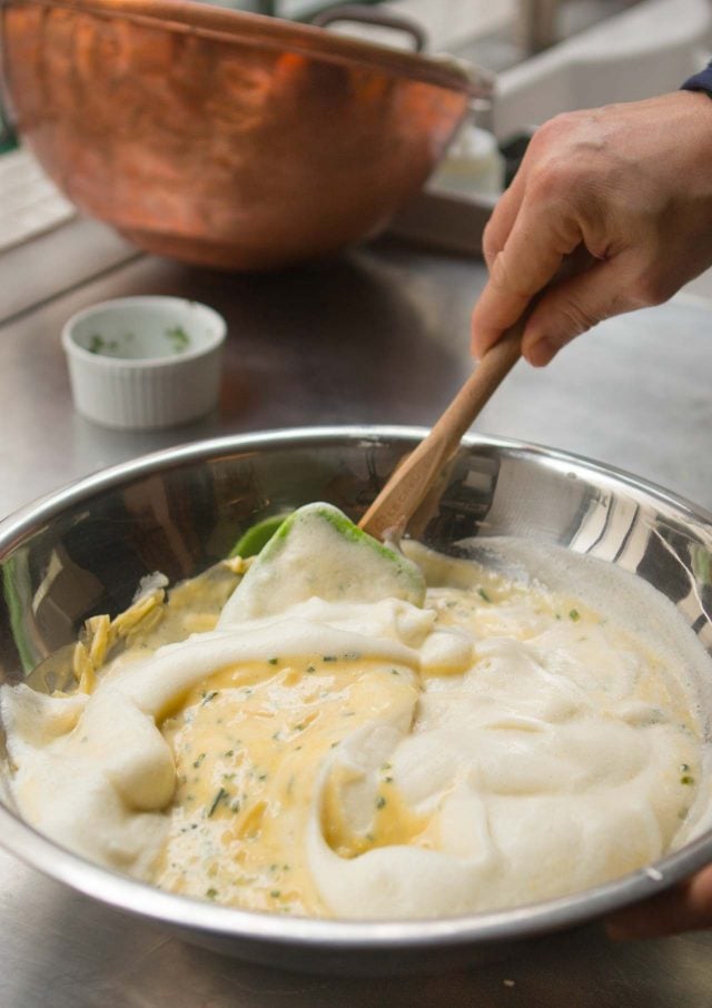 Either way, soufflรฉs arenโt hard to make and the only skill required is knowing that you should gently, but with purpose, fold the egg whites into the base. You donโt want to stir the heck out of them so they lose their volume. A few thin, visible streaks of egg whites are better than an overfolded mixture. (Less than what is shown above.) When baked, you wonโt notice those.