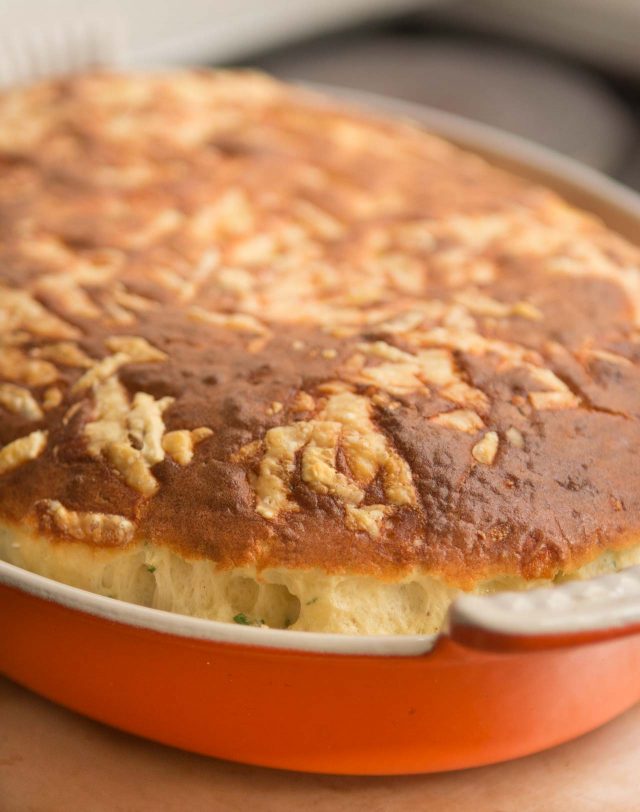 Even though I now have a collection of French soufflรฉ molds Iโve picked up at flea markets, these days I prefer to use an oven-proof shallow baking dish when I make a soufflรฉ. Why? Because I like the ratio of crust-to-filling better in a wider dish, and the soufflรฉ also tends to bake more evenly, and is easier to serve as well.