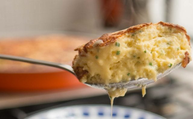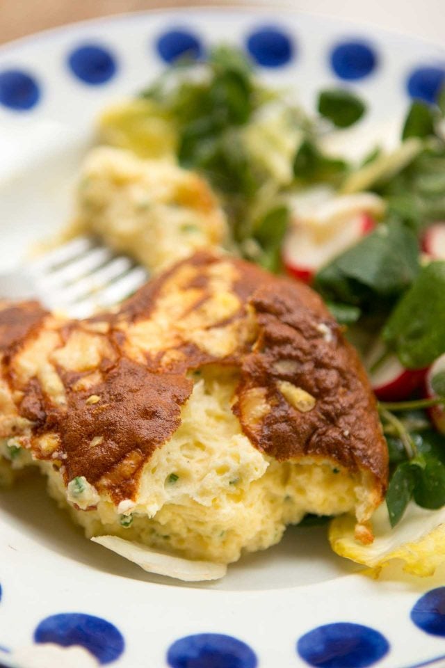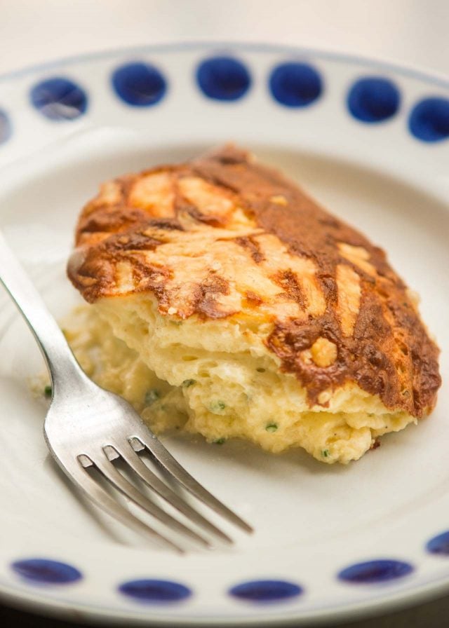 Cheese soufflรฉ makes a wonderful lunch or dinner with nothing more than a green salad to go alongside. I like to add a handful of aromatic herbs, which, like the cheese, will change the flavor depending on which you use. Here I used chives, but tarragon and chervil are also favorites that I sometimes add.