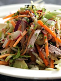 This recipe, of course is open to all sorts of variations. Roast pork, especially the kind sold by Chinese butchers, is wonderful. Or vegetarians can use sautรฉed tofu. No mangoes? Try orange segments or slices of nectarines. You can use Romainโ€™s French vinaigrette recipe, or make a batch of your favorite. For slaw like this, I like to enliven the salad dressing with a bit of soy sauce, balsamic, or a few drops of toasted sesame oil. In the summer, I like my dressings on the vinegary or tart side so although I didnโ€™t have any limes on hand, Iโ€™m sure a squeeze of lime juice would add a nice tang to the salad.