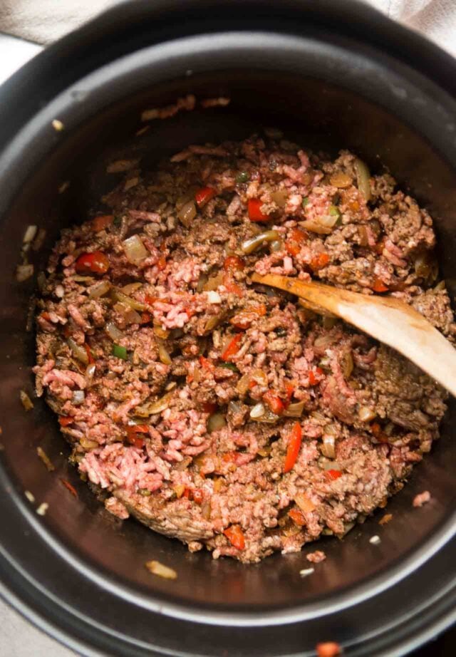 - Heat the oil over medium-high heat or on the sautรฉ function, if your machine has one. (See headnote.) Add the diced onion and pepper and cook, stirring occasionally, until cooked through and translucent, about 5 minutes. Add the garlic and jalapeรฑos and cook 2 minutes more, stirring occasionally, then stir in the chile powder, cumin, and oregano, stirring and cooking for 30 seconds or so, until fragrant.