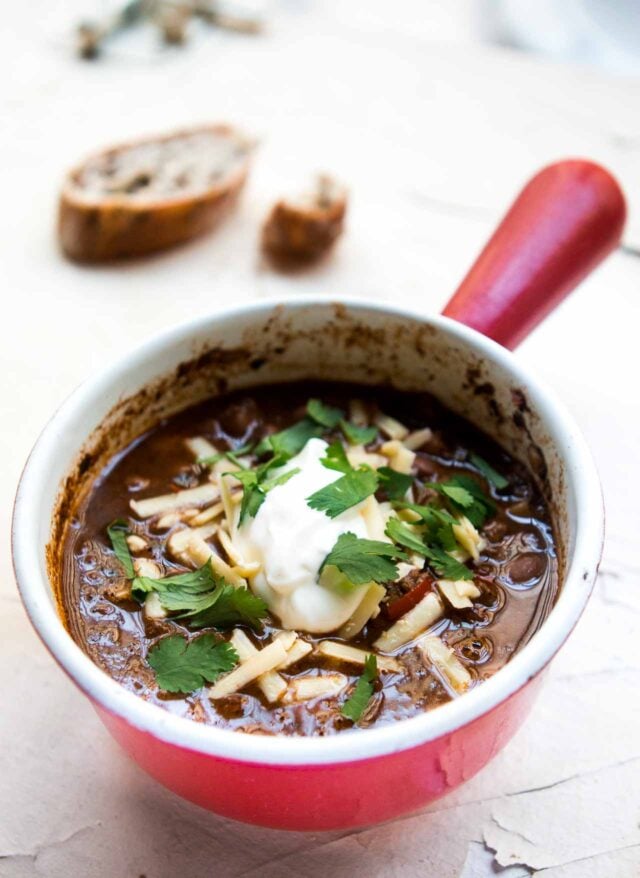 Whatever beans I had worked beautifully in the chili, although I did make it again with supermarket dried beans*, which required more time in the slow cooker than the ones I had used the first time. So feel free to cook them longer if necessary.