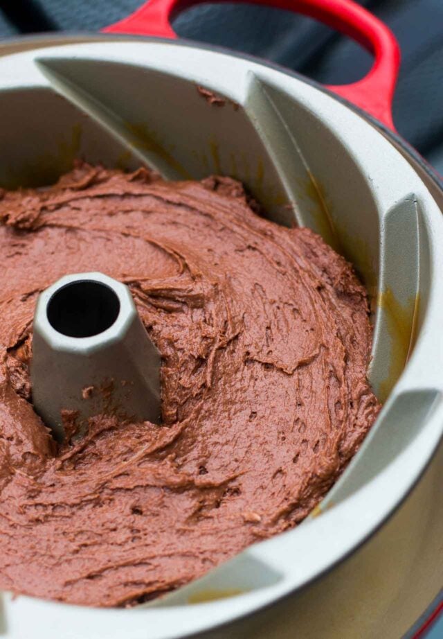 - Preheat the oven to 350ยบF (180ยบC.) Spray a bundt cake pan with a 10 cup/2,5l capacity with nonstick spray or lightly butter it, making sure if using butter you get in all the creases. (You can also use a 9-inch/23cm cake pan with 2 1/2-inch/6cm sides, but not a springform pan, which can leak.)