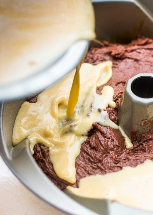 - Use a spatula to stir the wet ingredients into the dry ingredients, mixing just until combined. Give the pan with the dulce de leche in it a swirl if it's very liquid, then scrape the batter in the mold over the dulce de leche. (Okay if the dulce de leche has sunk back down to the bottom. It'll end up fine.)