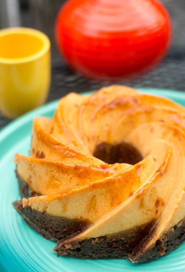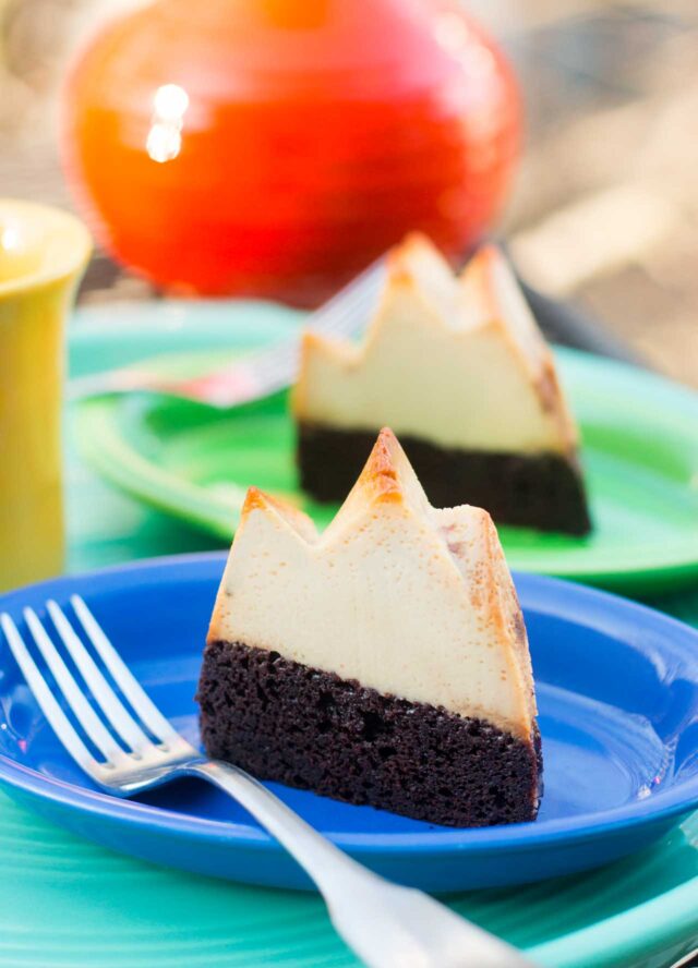 So here it is, the revised Chocoflan, also called Flan Imposibleย because it seems impossible when youโre putting it together that the thick cake batter on the bottom will somehow float through the custard while itโs cooking, to create a chocolaty layer of moist cake that becomes the bottom again when you flip it out of the pan. Got that?