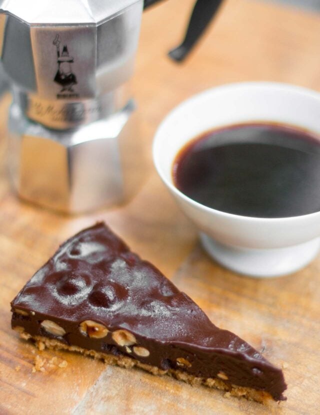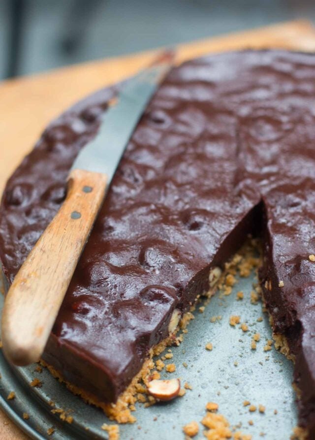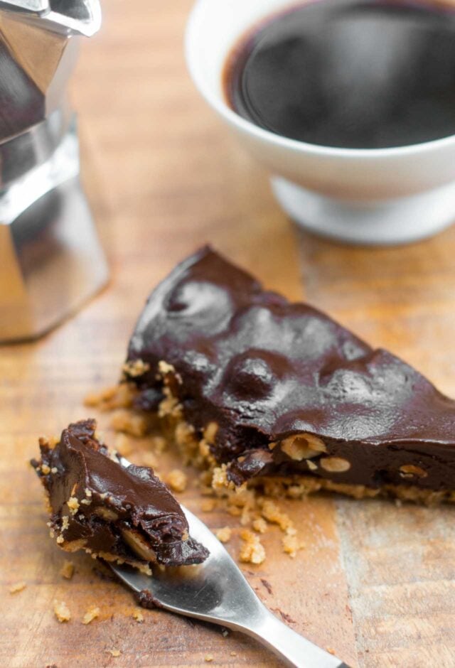This tart uses something enjoyable that I discovered back in the 1980s when I was a backpacker traveling through Europe, and landed in the Netherlands: Chocolate-hazelnut spread. (The brand that begins with an โNโ and rhymes with โfella.โ) As soon as I tasted my first swipe of it, I thought the nutty dark chocolate spread was the best thing Iโd ever tasted โ and even betterโฆit was for breakfast!