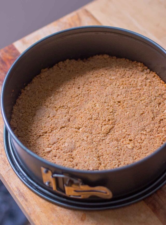 - In a medium bowl, mix together the Graham cracker crumbs, butter, and 1/8th teaspoon of the salt. Scrape the moistened crumbs into the springform pan. Spread and shake the pan so they're in an even layer, then press them down with the bottom of a water glass so the buttered crumbs are as even as possible.