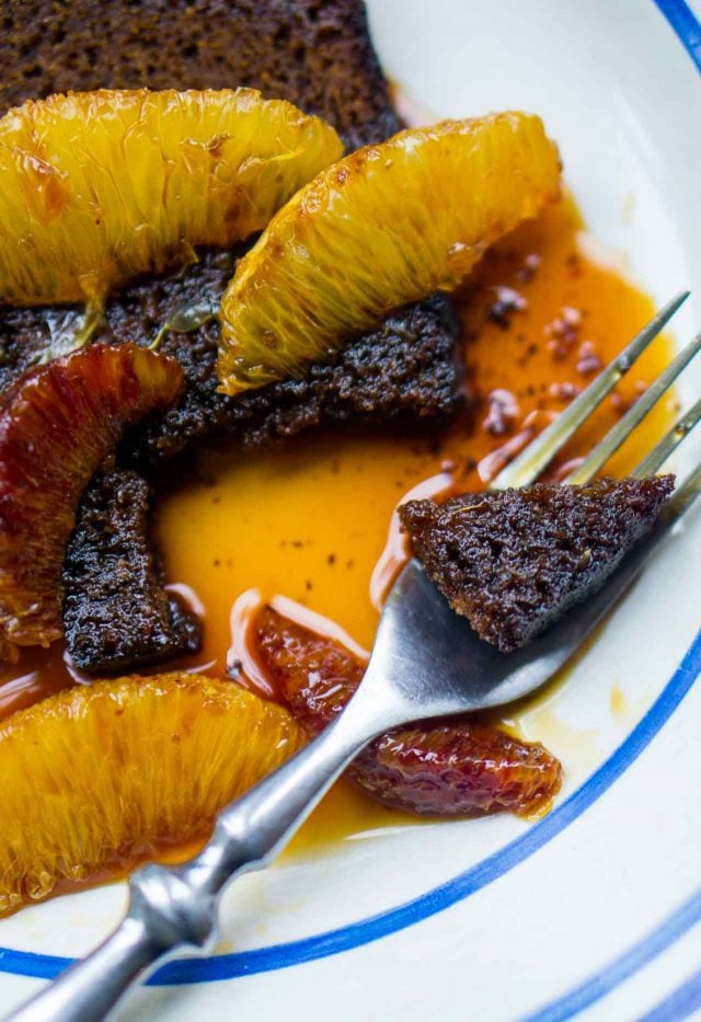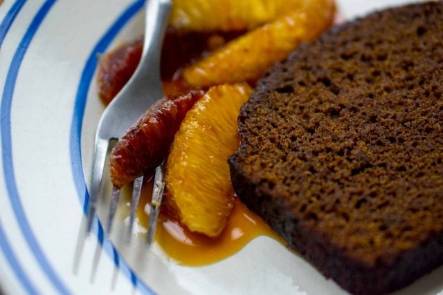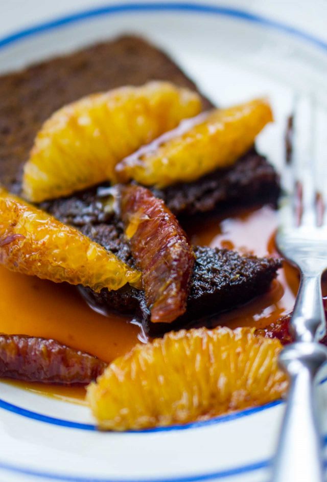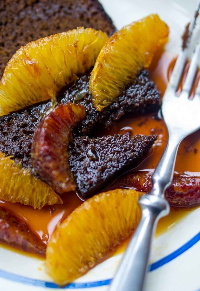 Caramelized oranges were a recommended accompaniment with this cake, which I served alongside. You could also serve it with poached pears, a scoop of cinnamon ice cream (or vanilla ice cream), or sabayon. In the summer, you can put strawberries or peaches into play alongside, with a scoop of ice cream or a dollop of whipped cream.