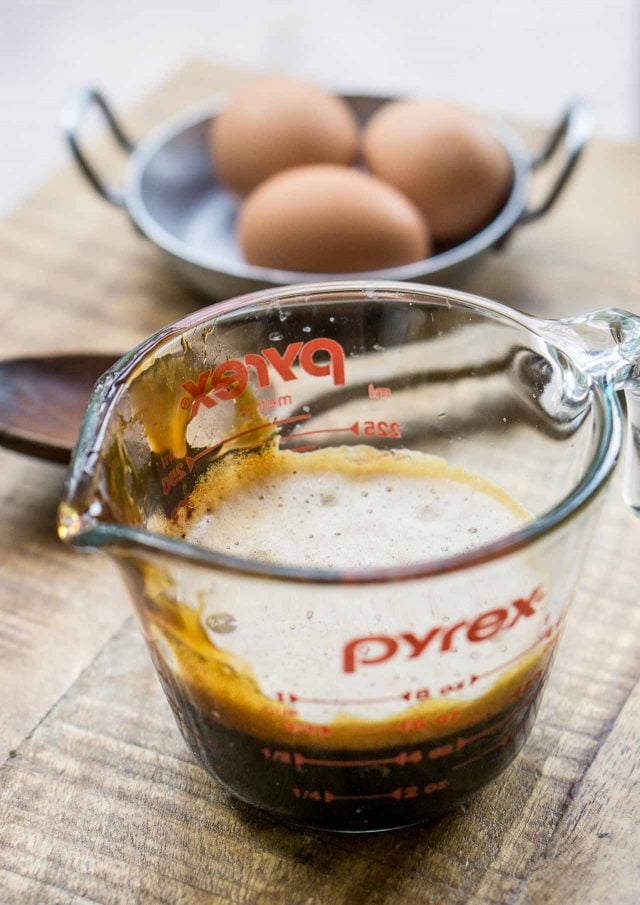 - In a large bowl, whisk the eggs with the granulated and brown sugar until there are no lumps, then whisk in the oil.