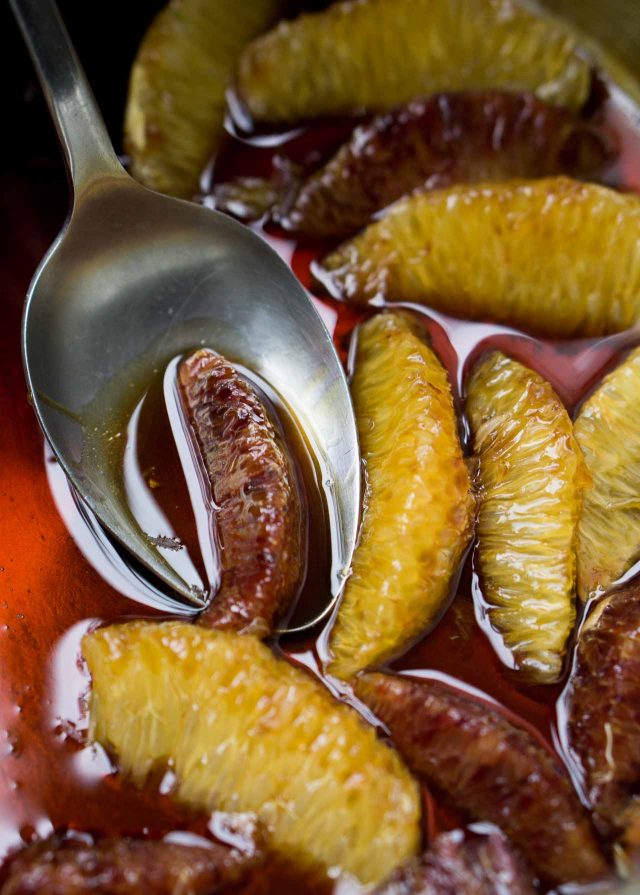 Rewarm the mixture over low to medium heat, stirring if necessary, to dissolve and smooth out the caramel. Remove from heat and stir in the oranges along with a tiny pinch of salt. The oranges can be made up to a day in advance, but they donโt improve if made any farther ahead.