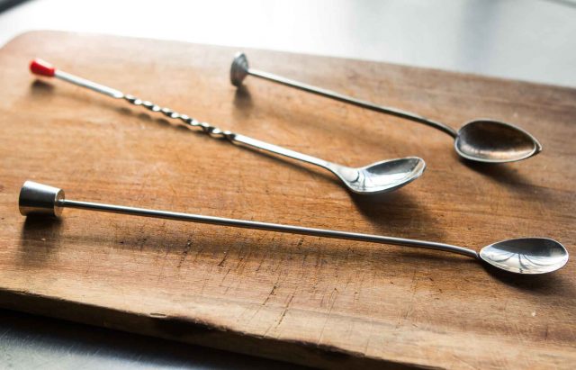 One of the first things I realized that I needed to upgrade when I started mixing a lot of drinks was my bar spoon. I had bought one of those plastic, red-tipped numbers with the spiral stem (above), that are sold cheaply at restaurant supply stores. After my fingers felt like I was stirring sharpened blades, I bought the stirring spoon on the bottom, which can do double-duty as a muddler. If you go for a spoon with spiral grooves, I recommend spending a little more to get one with well-designed spirals that feel good in your hand.