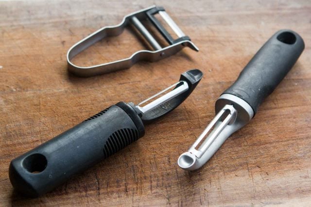 Once again Oxo comes to the rescue with my favorite swivel peelers. Theyโre nice and sharp, and stay that way. Iโve had both of mine for years. In Europe, I keep one of the U-shaped ones on hand (shown above the other two peelers) as locals are used to them and find them easier to use. If you use one and it has a similar-looking blade, wash and dry it just after using as the blade can rust. These are used primarily for making citrus twists for garnishes.