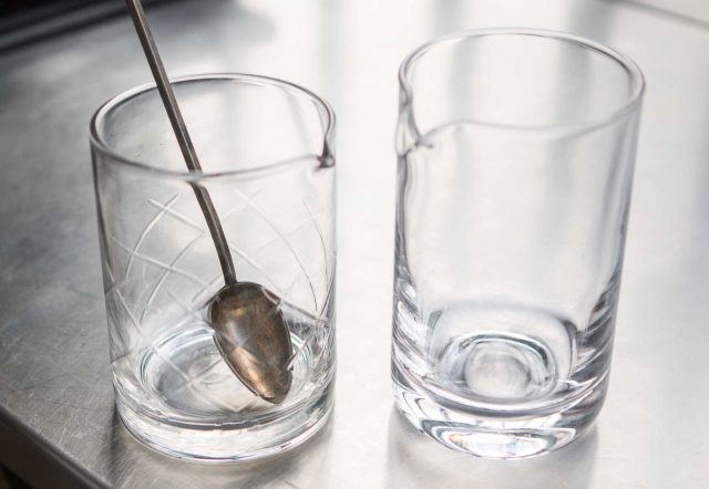 I have two mixing glasses, One is from West Elm (the cut glass one on the left) which I got with a gift certificate someone gave me, and the other I found on Ebay (on the right), which is new. I like the clean lines of the clear one, but the one on the left is wider and more stable, so itโs easier to stir briskly in.