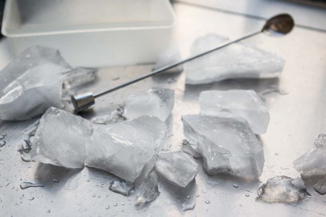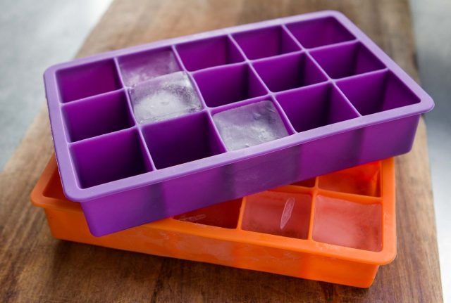 If you donโt want to buy ice cubes trays, you can make your own โartisanalโ ice by filling a wide plastic container partially full of water and freezing it. When ready to use, slip the block of ice between a kitchen towel (or in a Lewis bag, which is also good for making crushed ice) and break it up with a mallet or something similar. The large chunks of ice (or the crushed ice) will make you look like a pro!