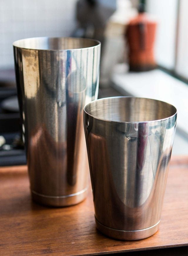 I now use a Boston shake, which comes in two pieces. Youโll need to have a separate strainer. Mine (above) is made by Lumian and the two tins are slightly weighted, which makes shaking easier. Also youโll notice the smaller tin has a slightly curved inward lip, which helps in getting the two parts apart after youโve shaken a cocktail.