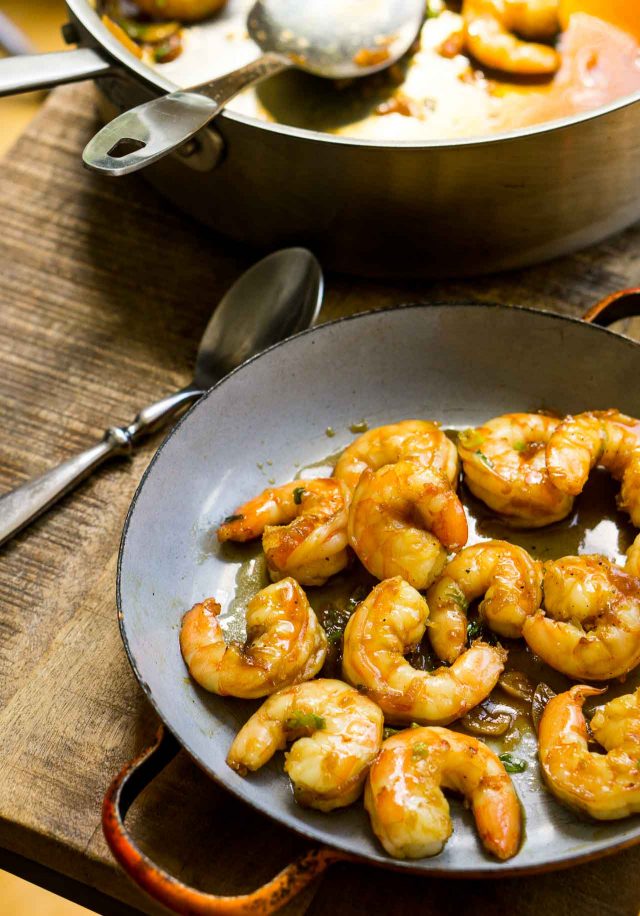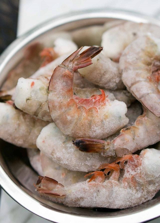 When shopping for the shrimp, Iโd read somewhere that most โfreshโ shrimp on offer at seafood markets is previously frozen. So youโre better off (financially) buying frozen shrimp. In this case, I wanted to use wild (sauvage) shrimp, and all I could find were frozen, so I used those to make this dish.