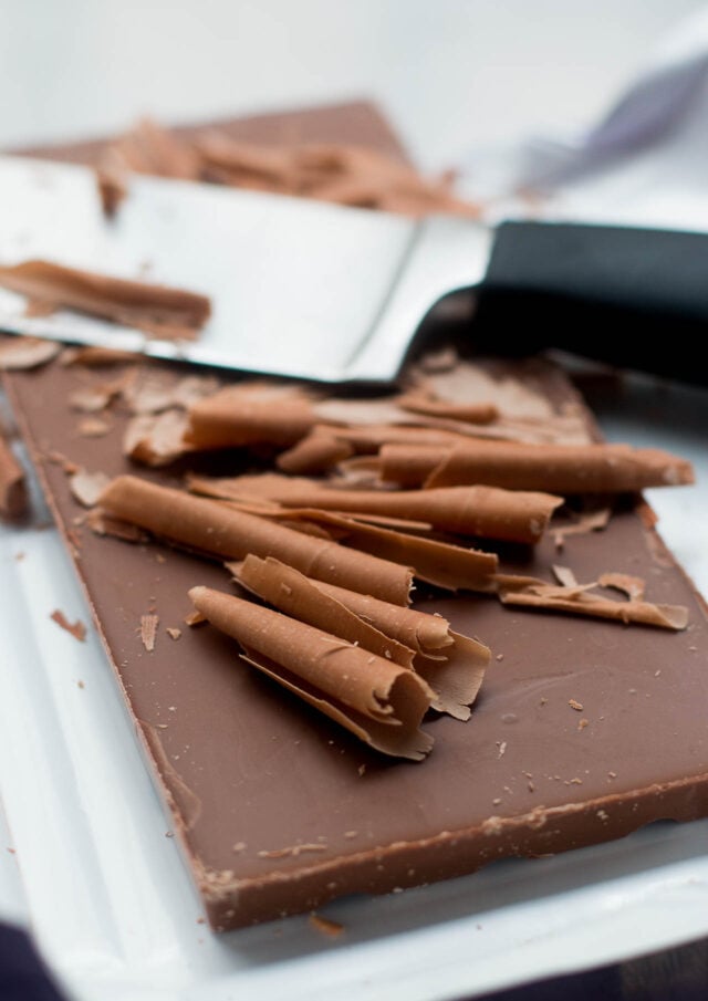 Place the block longwise at the edge of the counter youโre standing at and, holding the bar in place against you with your waist, holding the handle and the top of the blade, scrape curls toward you with the knife at a near 90ยบ angle, angling the blade just a bit away from you as you drag it down. You donโt have to press down very hard and after few tries, youโll find the angle and pressure that works best for you. Of course, be careful dragging the knife toward you and make sure the blade is facing away from you. You can also use a sharp swivel-bladed vegetable peeler and make shorter curls by running it down the long side of a chocolate bar. Once again, milk chocolate is softer and easier to use than dark if you want more cohesive curls. But thereโs no shame in shards, either.
