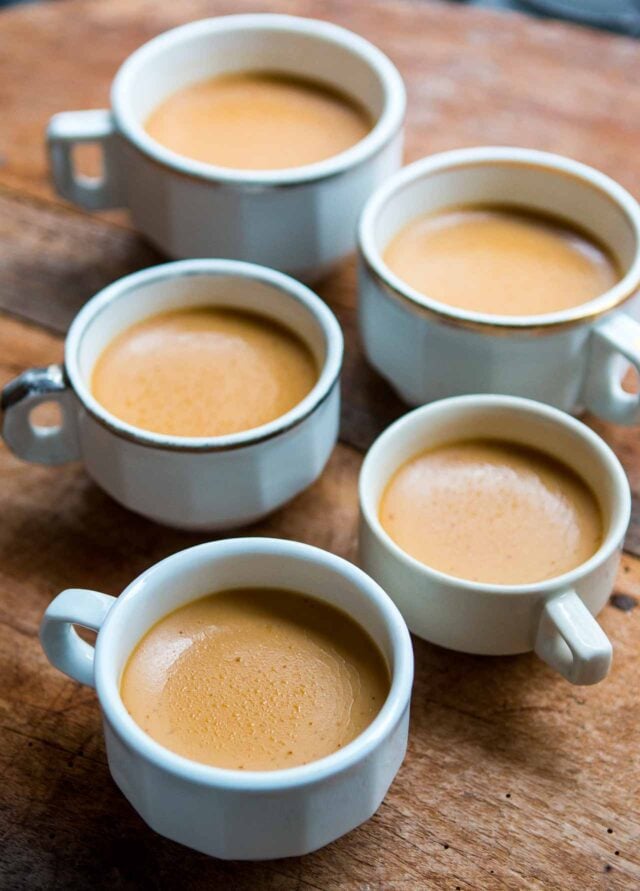 As mentioned, I made a few batches of this Coffee Caramel Panna Cotta before settling on the proportions here. I know some of you may have questions about using gelatin and gelatin substitutes, which I answered here. In Europe, sheet gelatin is more prevalent but sheets vary in size and in strength, ranging between five different strengths. The best approximation here would be to use two sheets of gelatin: a general rule is 3 sheets of gelatin equals one 1/4 ounce (7g) envelope gelatin. To use sheets here, soften them in a bowl of cold water for a few minutes then wring them out and add them to the warm (not boiling hot) caramel mixture after youโve added the cream.