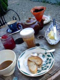 So now my breakfast consists ofย coffee, juice, and toast, then I have a fruit salad around mid-morning, although I remember Romainโs French father beingย astounded to see meย eating between meals. โCโest formidable!โ he said, watching me eat a bowl of fresh fruit one morning around 10am, as if I was some sort of radical for stuffing my crawย between the prescribed meal times.
