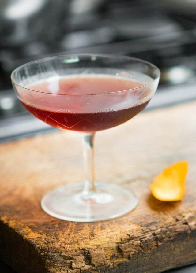 - Fill two-thirds full of ice and stir briskly until well-chilled, 15 to 20 seconds. Strain into a chilled coupe glass. Hold the orange twist over the glass, colorful side down, and squeeze the zest over the glass so the oils spray into the drink. (I don't put the zest in the glass to garnish it afterward, but you could if you wish.)